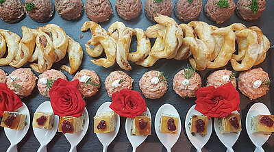 Wir empfehlen zusammen mit den Getränken 2 bis 3 feine Häppchen pro Person zu servieren, mehr nicht, um den Appetit auf was kommt beizubehalten. Eine Auswahl finden Sie in der Broschüre "Feste und Feiern".