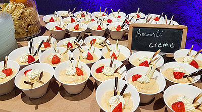 Bei uns dürfen Sie bequem aus unserer Broschüre "Feste und Feiern" Ihre Menüs zusammenstellen. Da findet sich eine schöne Auswahl an servierten Leckereien oder auch Büffet-Möglichkeiten. Natürlich darf dies auch kombiniert oder bei einer persönlichen Beratung ein individuelles Menü kreiert werden. Wir kochen vorwiegend mit Schweizer Fleisch und beziehen regionale und saisonale Zutaten, wenn diese erhältlich sind. Der Service, Gedeck inklusive Tischtücher und Servietten sowie die von unserem Team nach Ihren Wünschen aufgestellten Tische und Stühle sind im Menüpreis inbegriffen.