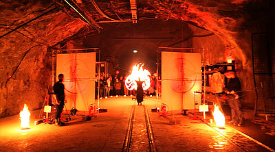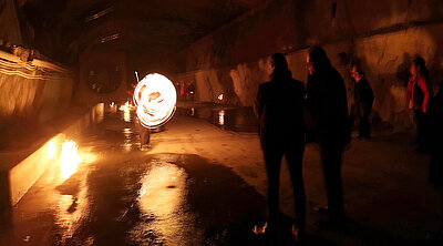 Wider Erwarten werden Sie auf einem mit Laternen beleuchteten Weg zum geheimnisvollen oberen Eingang des Stollens gebracht und von den ersten Feuerkünstlern begrüsst.