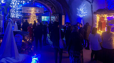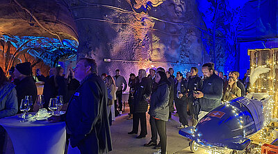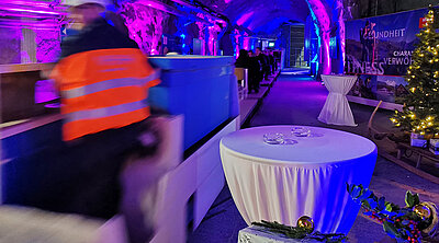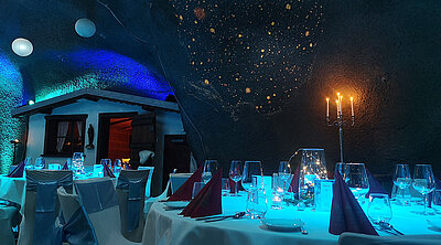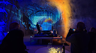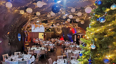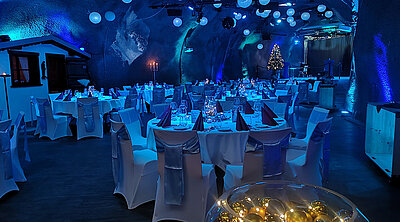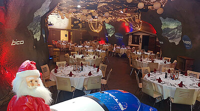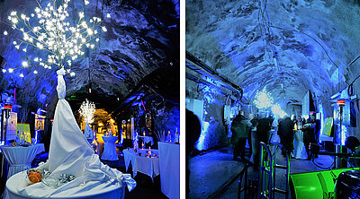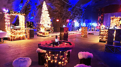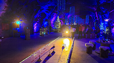 The mulled wine aperitif and delicious snacks are served in the Christmas village of the large and impressive "Glück auf" cavern, along with entertaining curling.