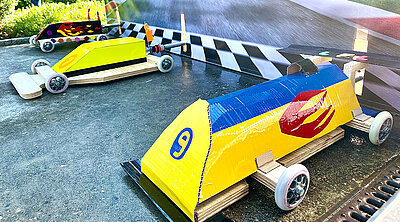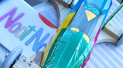 With scissors, pencils, rulers, cutters, adhesive foils and hot glue guns, you build your own rocket race car with a lot of creativity and attention to detail. After building, the teams present the cars to each other and try to convince the other teams of your building concept.