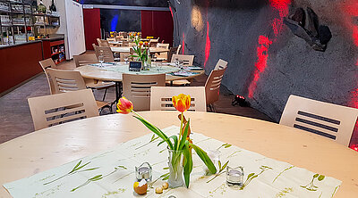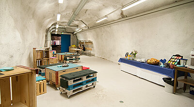 Mieten Sie den Seminarraum Querschlag für kleinere Gruppen. Der Raum eignet sich sehr gut in Kombination mit praktischen Aufgaben im Stollen.