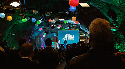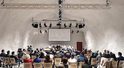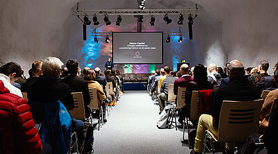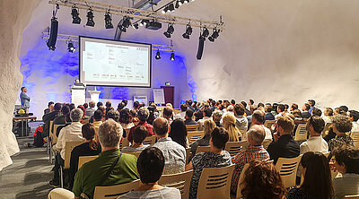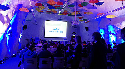 In der technisch gut ausgerüsteten Event-Kaverne werden während der World Systemic Forum Konferenz über die Mittagszeit Präsentationen gehalten.